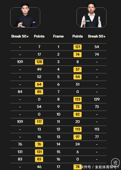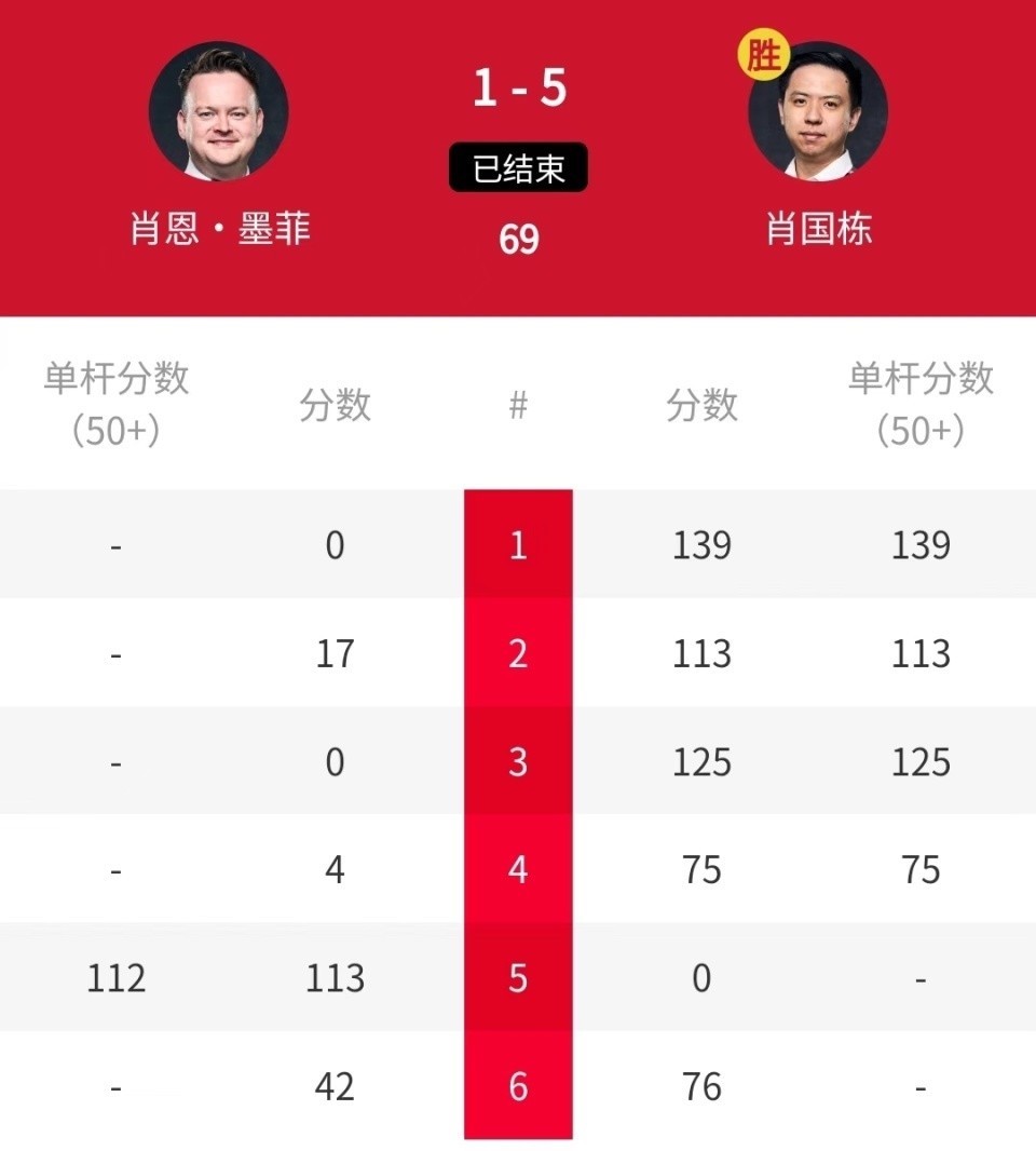 这场比赛第一局,肖国栋开局开头发力,他打出单杆67分,89-8先拔头筹,1-0逾越。第二局,肖国栋通过几次上手,65-23再胜一局,2-0逾越。第三局,肖国栋单杆69制胜,69-7赢下,比分上风扩大到3-0。