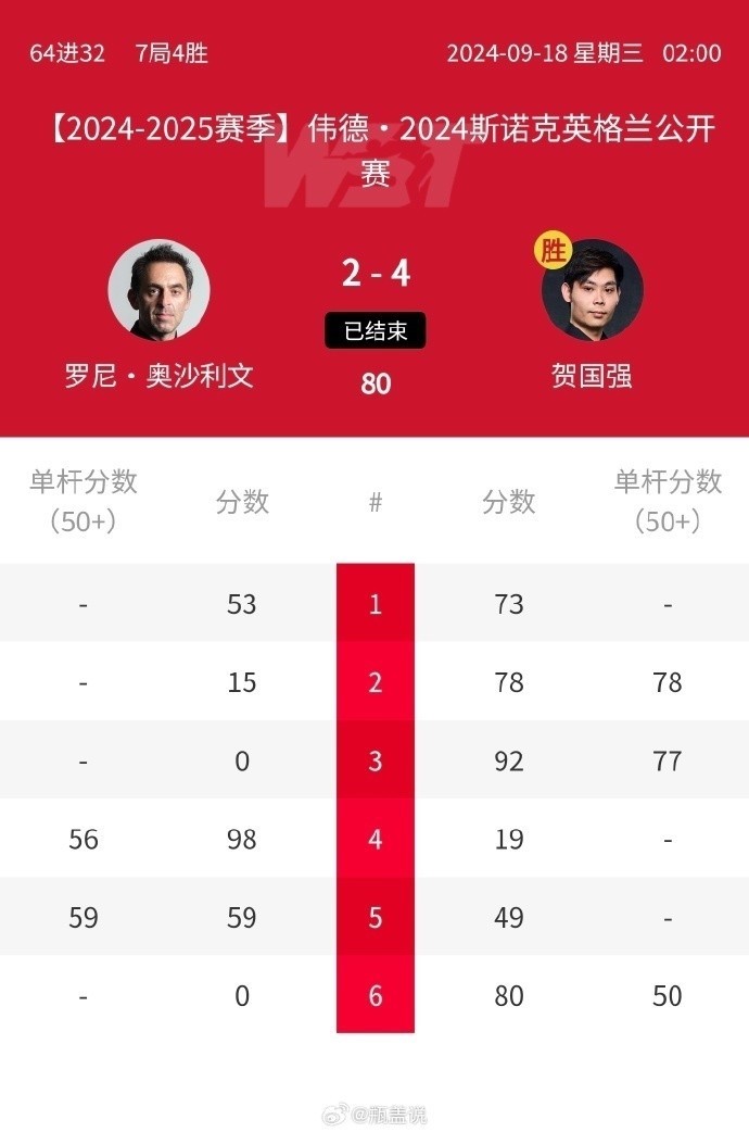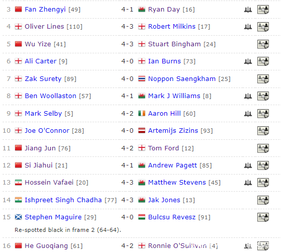 第一轮第二个比赛日,共有国强、吕昊天、徐念念、肖国栋、龙泽煌、周跃龙等6名中国选手出战,其中,年度最好少壮国强给求米带来惊喜,他以4-2投诚7届世锦赛冠军“火箭”罗尼-奥沙利文。